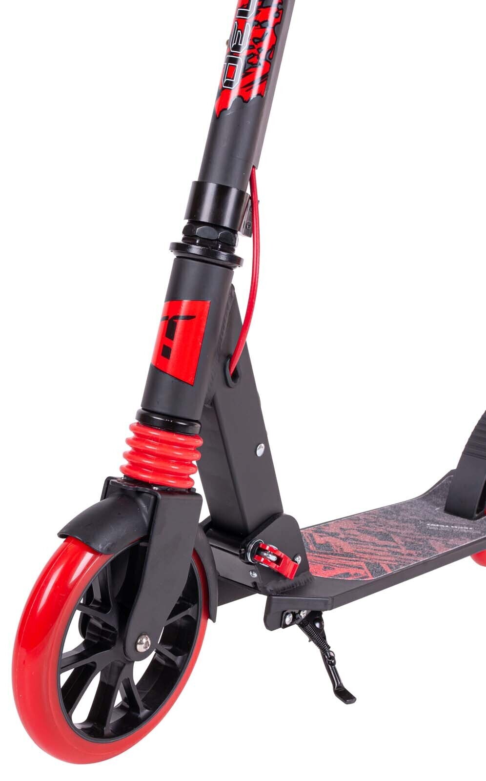 Прочная алюминиевая дека шириной 12 см и длиной 53 см покрыта износостойкой шкуркой (рабочая часть деки "footspace" - 32,5 см). Для удобства парковки самокат оборудован складывающейся подножкой.