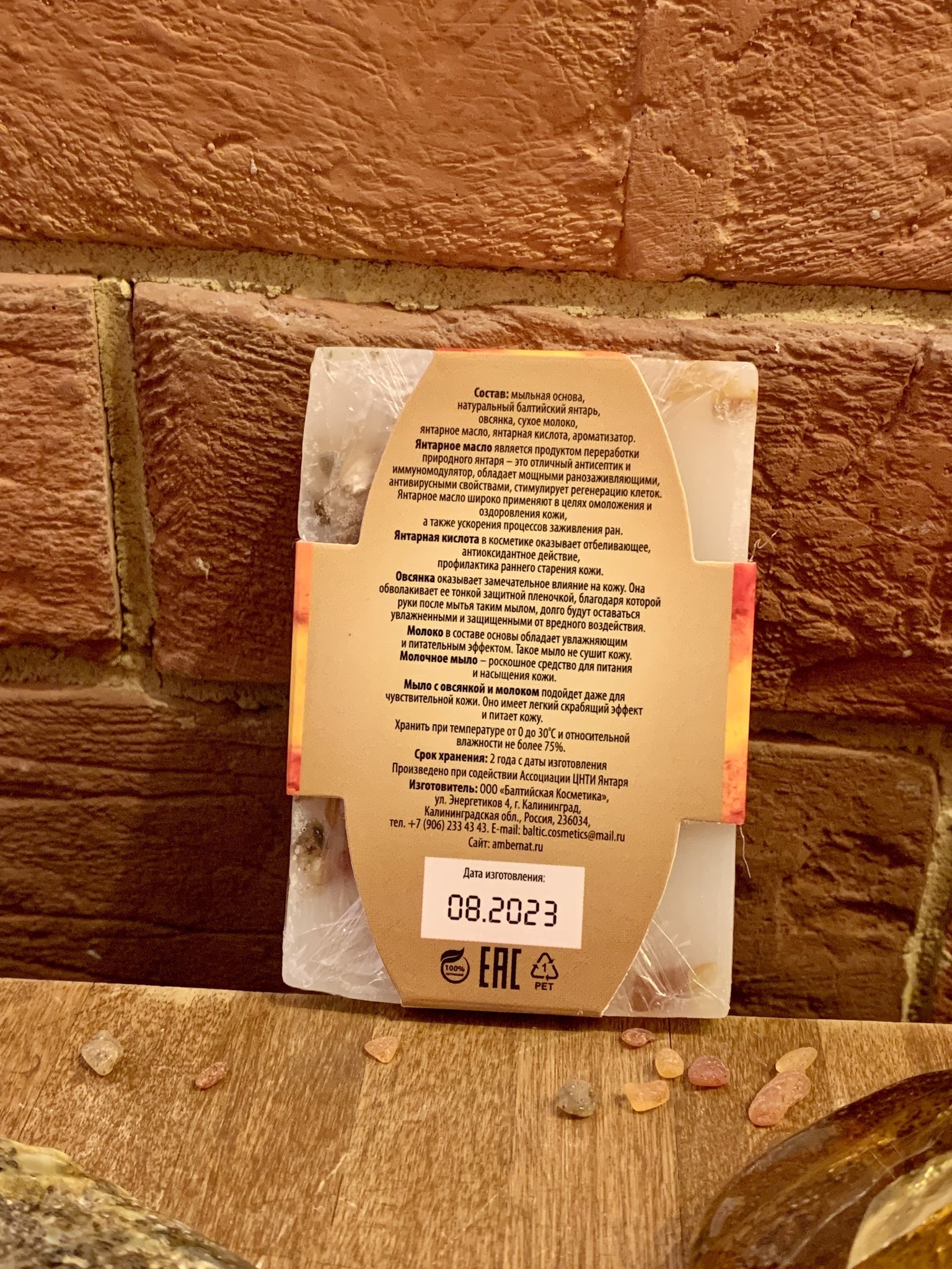 Состав: мыльная основа, натуральный балтийский янтарь, овсянка, сухое молоко, янтарное масло, янтарная кислота, ароматизатор.