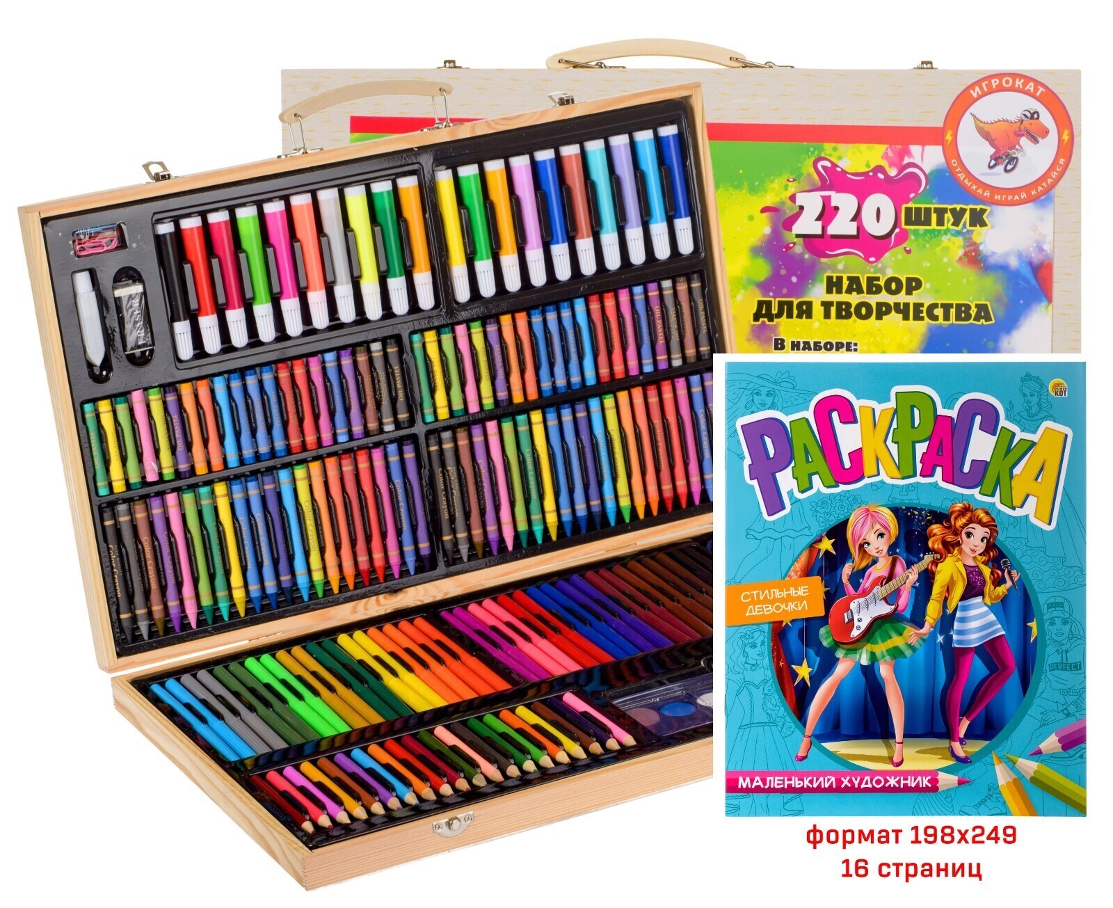 Набор для рисования для девочек "Игрокат №35" 220 предметов в деревянном кейсе и раскраска "Стильные девочки"