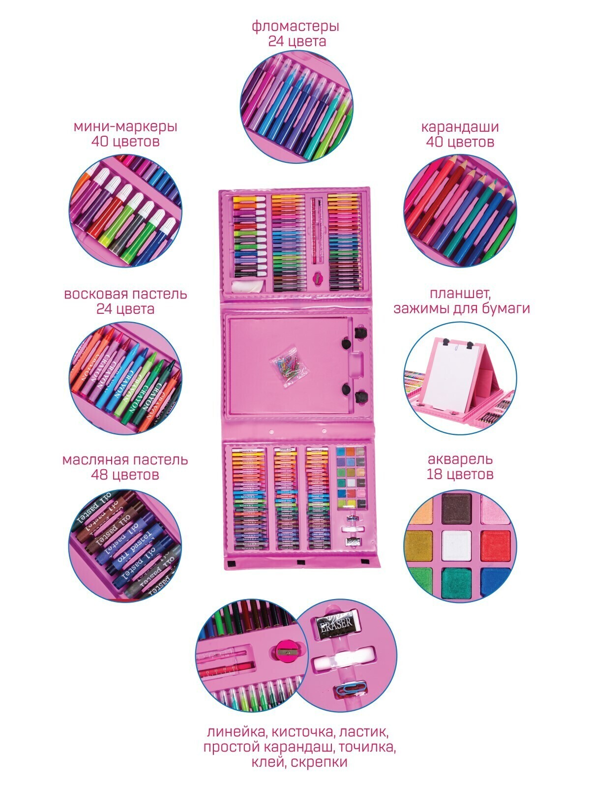 Вы получите чемоданчик с 208-ю предметами для рисования : фломастерами, карандашами, мелками и красками. Для каждого типа предметов предусмотрена свой тип ячеек, то есть сборка чемоданчика превращается в интересную игру. Больше не надо будет искать нужный карандаш по всему дому. Большой объём предметов вызывает живой интерес и желание порисовать. В собранном состоянии занимает мало места. Отличный подарок.