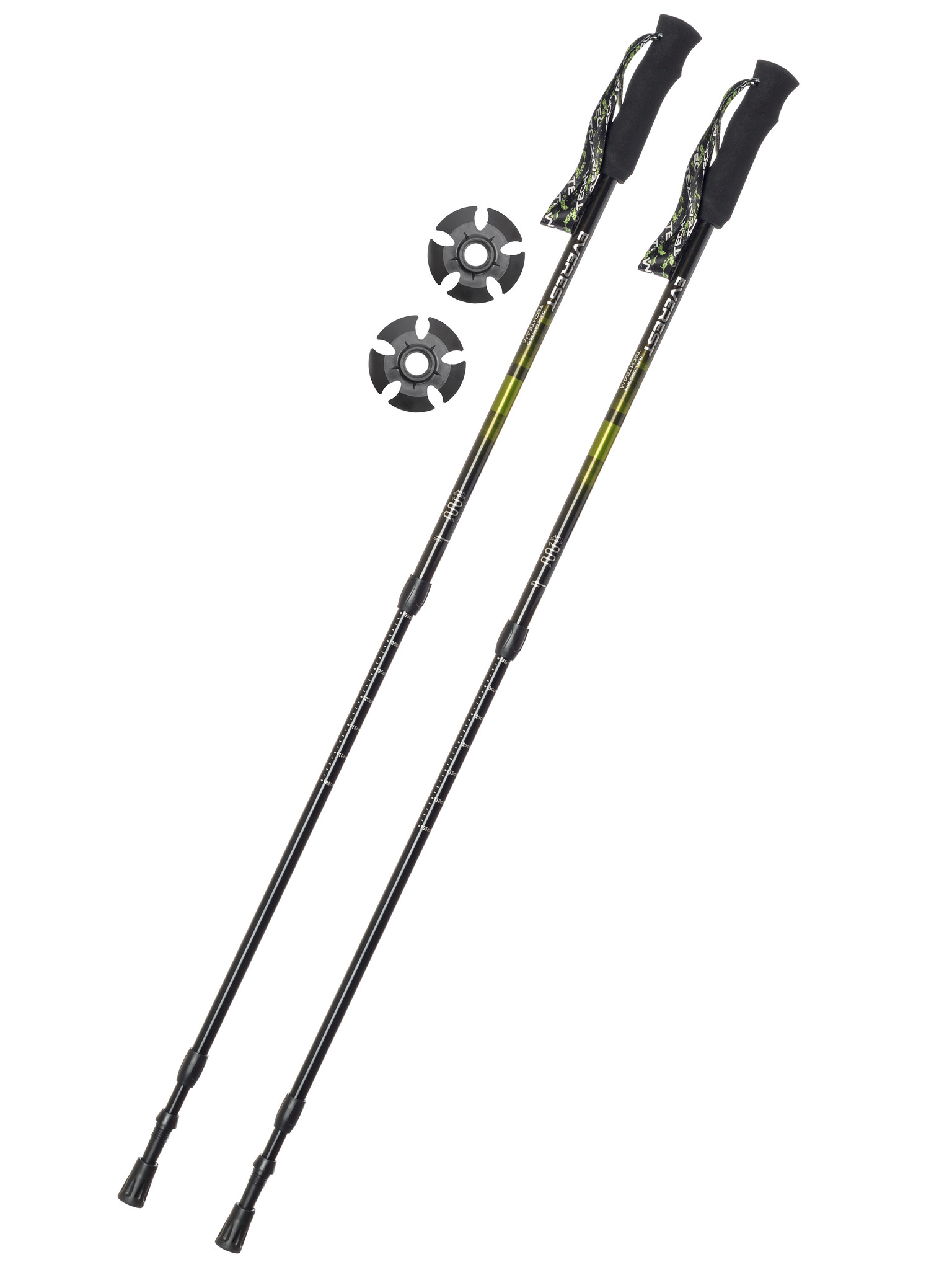 Антишок-система встроенная внутри палок, снимает ударную нагрузку с суставов туриста. Каждая палка состоит из трех секций. Длина палок в сложенном состоянии 63,5 см, в разложенном состоянии 135 см, что достаточно для роста до 195 см.