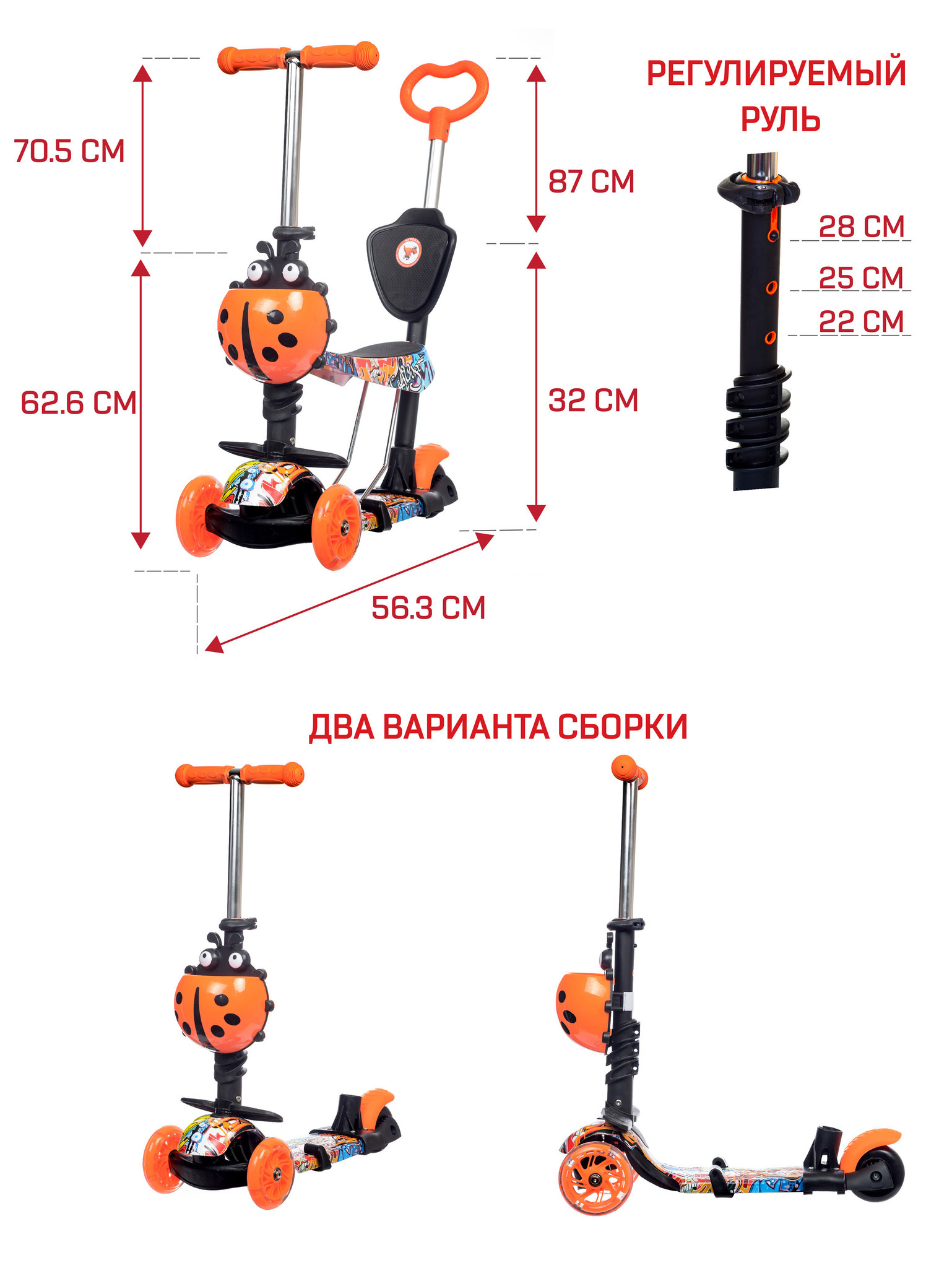 Регулируемый по высоте телескопический руль (63-70 см.), с мягкими резиновыми ручками с широкими заглушками для защиты позволит подобрать комфортную высоту. Сиденье с мягкими вставками можно установить в трех положениях. На родительской ручке установлена спинка сиденья, для варианта, когда вы везете ребенка. Площадка для ног с противоскользящими элементами: длина 28 см., ширина 14 см. Спереди можно установить пластиковую корзину для детских мелочей в виде смешной букашки.