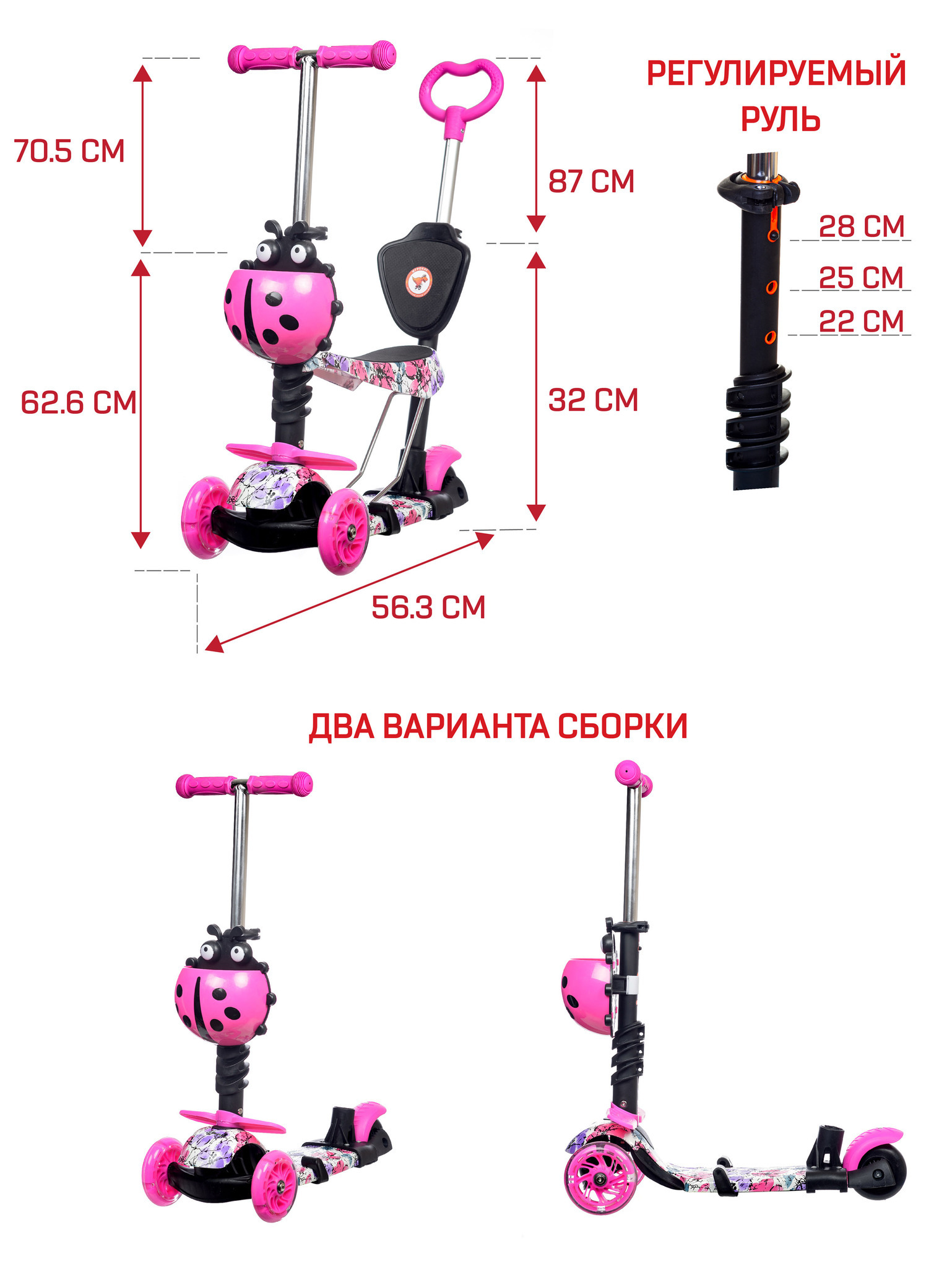 Регулируемый по высоте телескопический руль (63-70 см.), с мягкими резиновыми ручками с широкими заглушками для защиты позволит подобрать комфортную высоту. Сиденье с мягкими вставками можно установить в трех положениях. На родительской ручке установлена спинка сиденья, для варианта, когда вы везете ребенка. Площадка для ног с противоскользящими элементами: длина 28 см., ширина 14 см. Спереди можно установить пластиковую корзину для детских мелочей в виде смешной букашки.