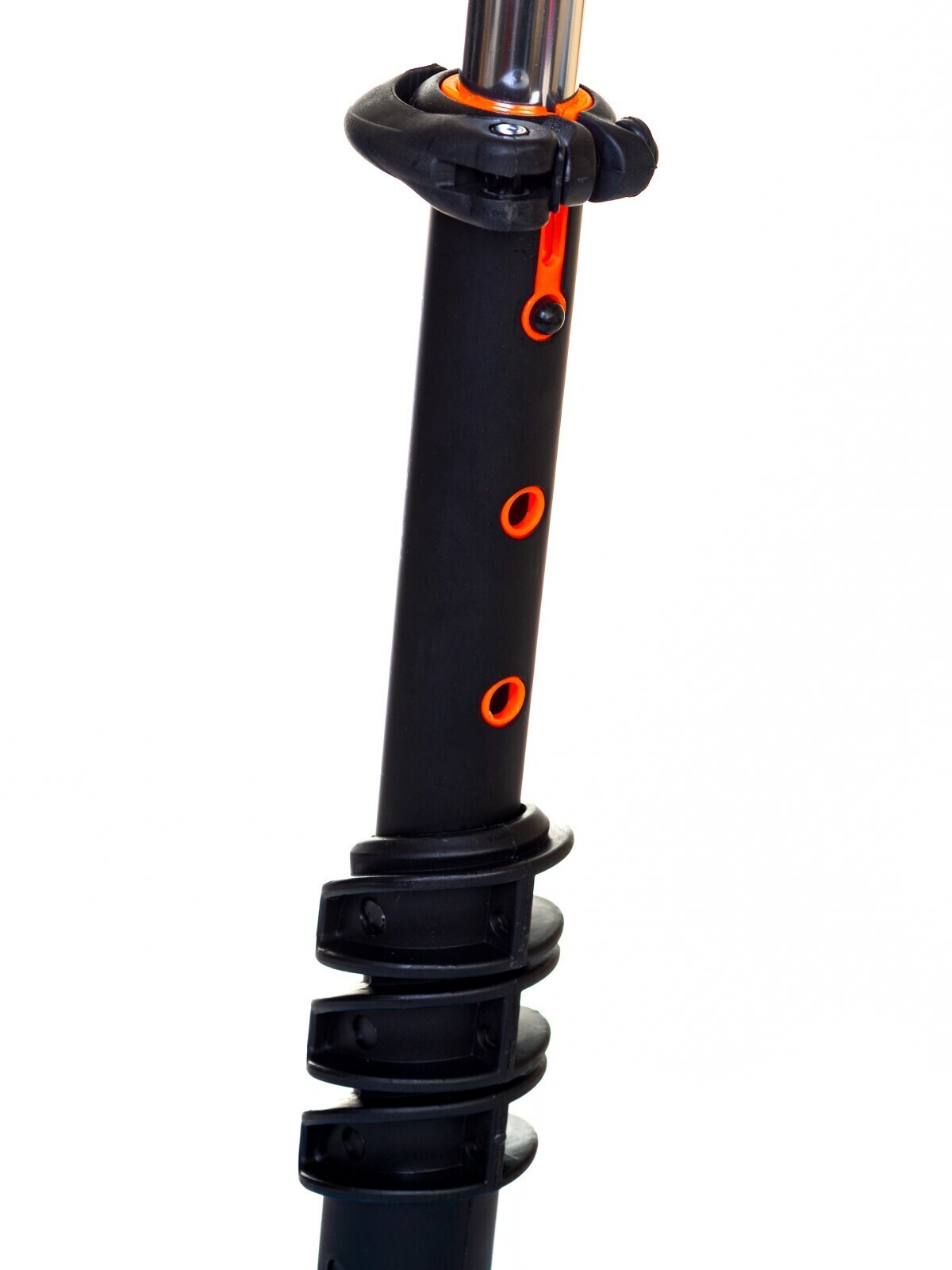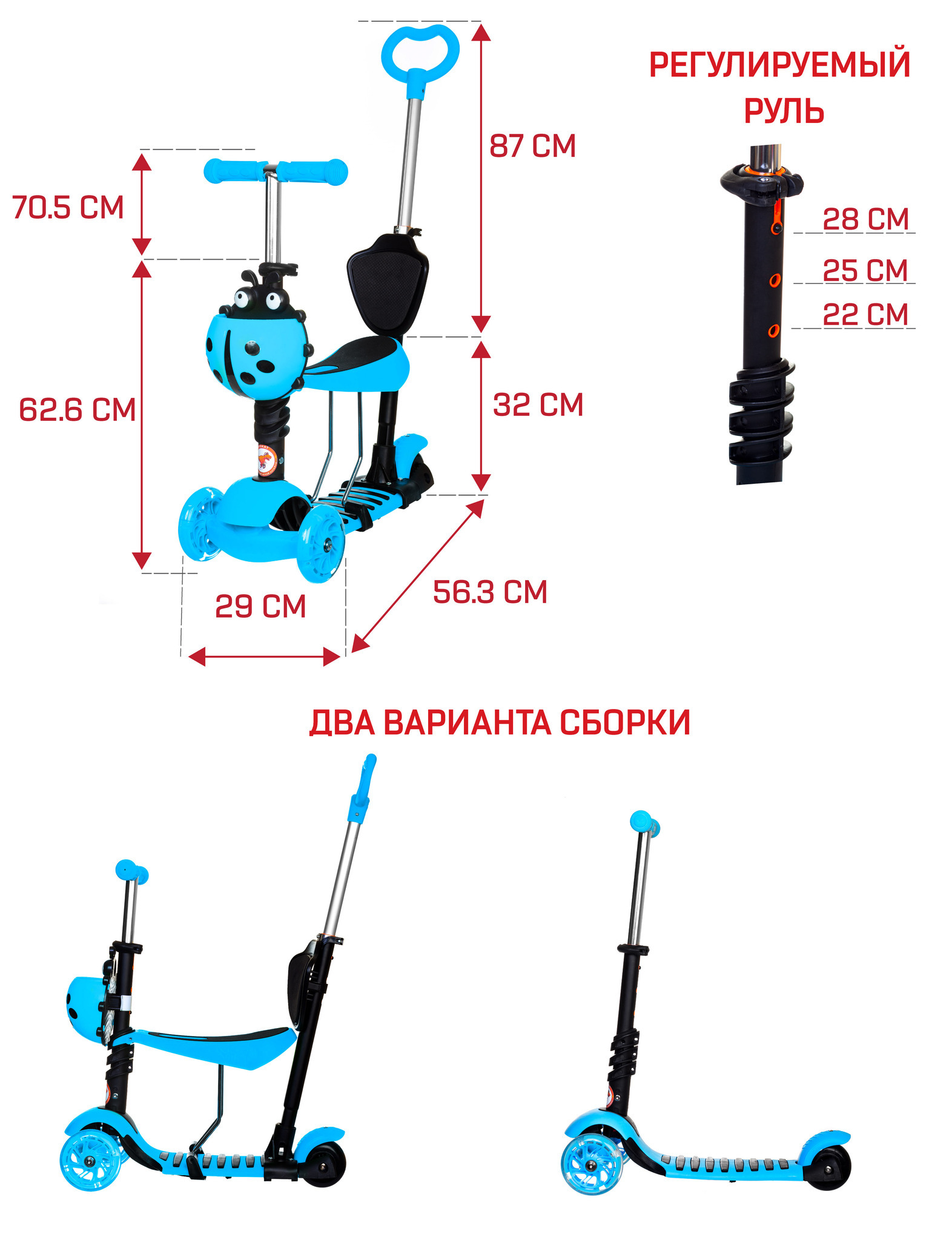 Регулируемый по высоте телескопический руль (63-70 см.), с мягкими резиновыми ручками с широкими заглушками для защиты позволит подобрать комфортную высоту. Сиденье с мягкими вставками можно установить в трех положениях. На родительской ручке установлена спинка сиденья, для варианта, когда вы везете ребенка. Площадка для ног с противоскользящими элементами: длина 28 см., ширина 14 см. Спереди можно установить пластиковую корзину для детских мелочей в виде смешной букашки.