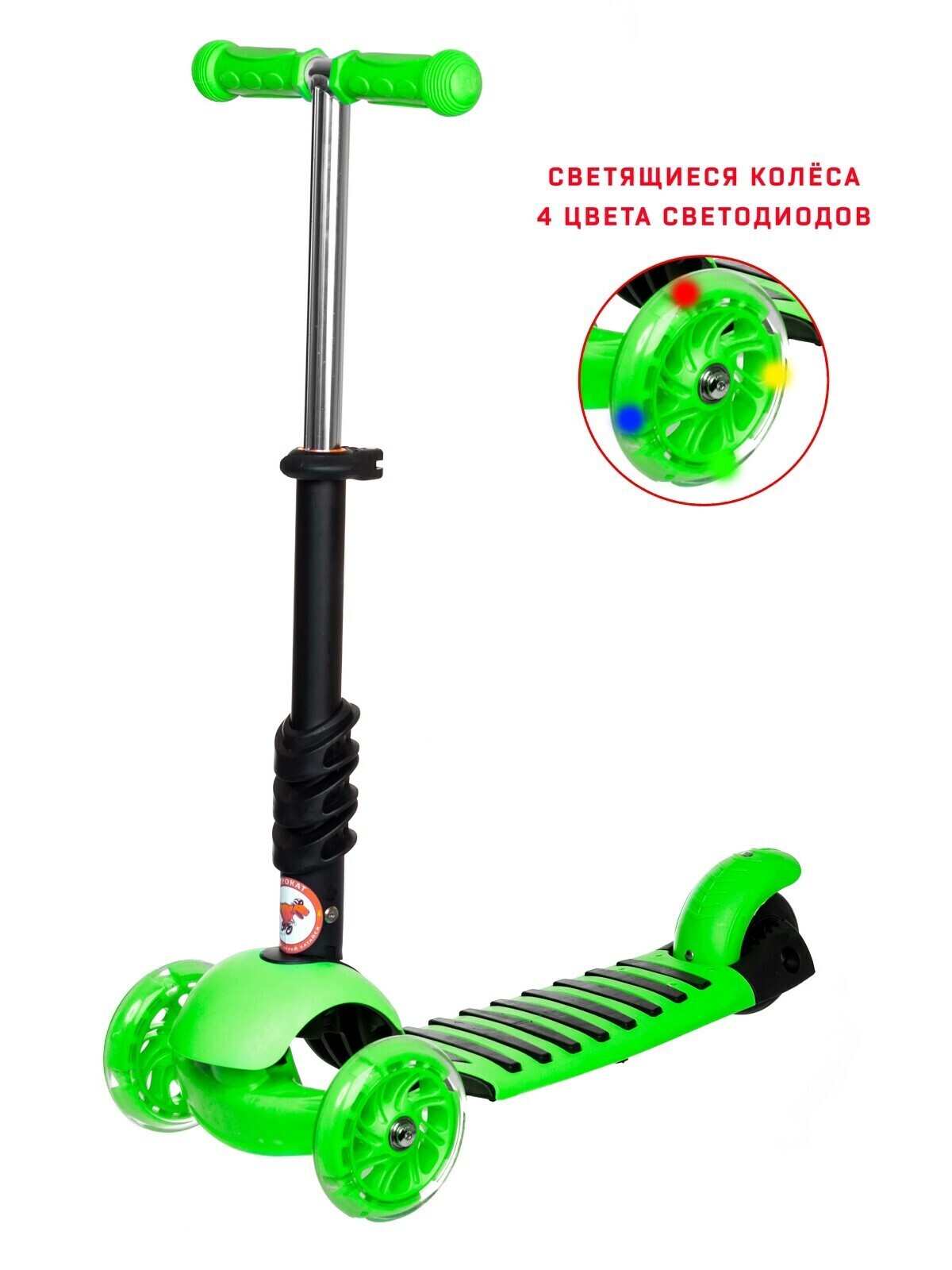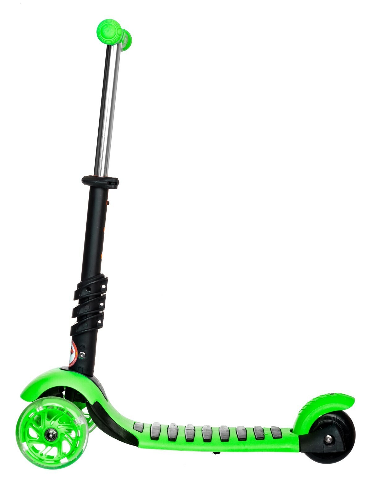 Красивый дизайн с большими (120 мм) светящимися полиуретановыми передними колесами. Сзади установлено одно, но толстое колесо с фрикционным тормозом.