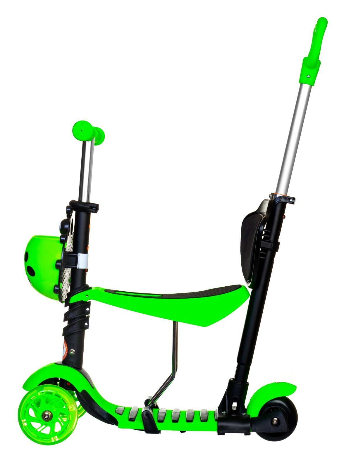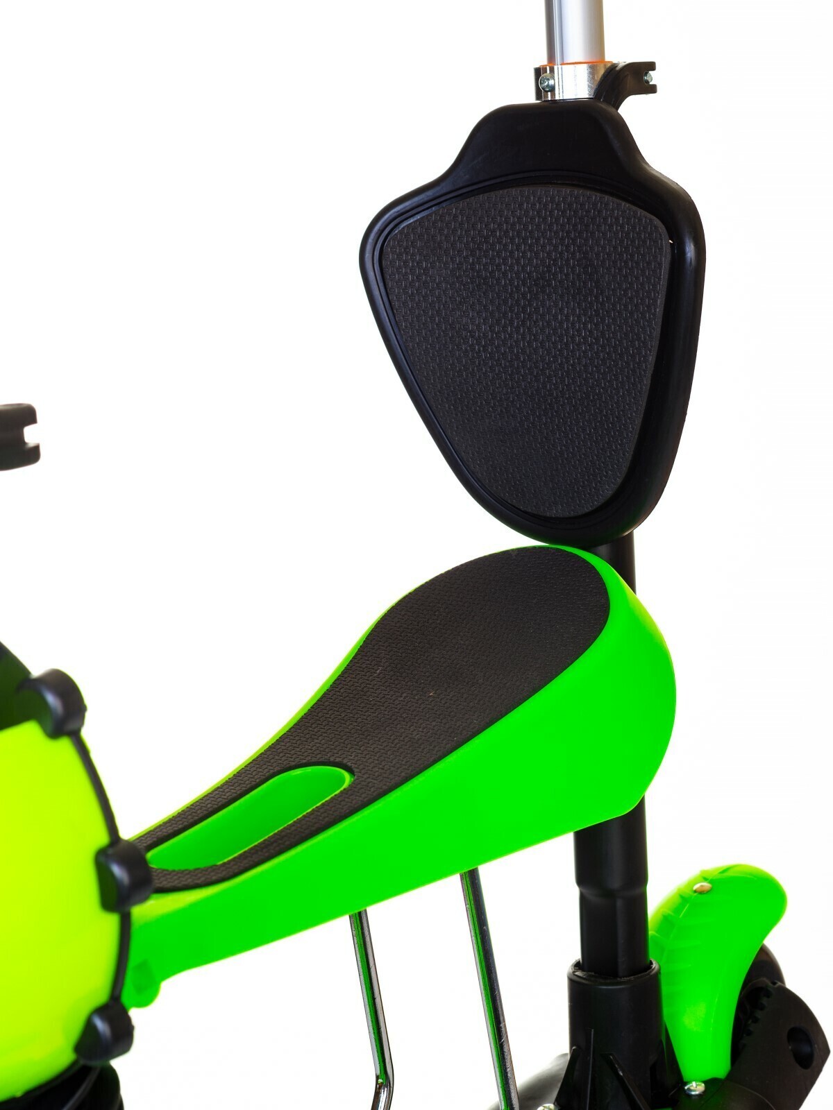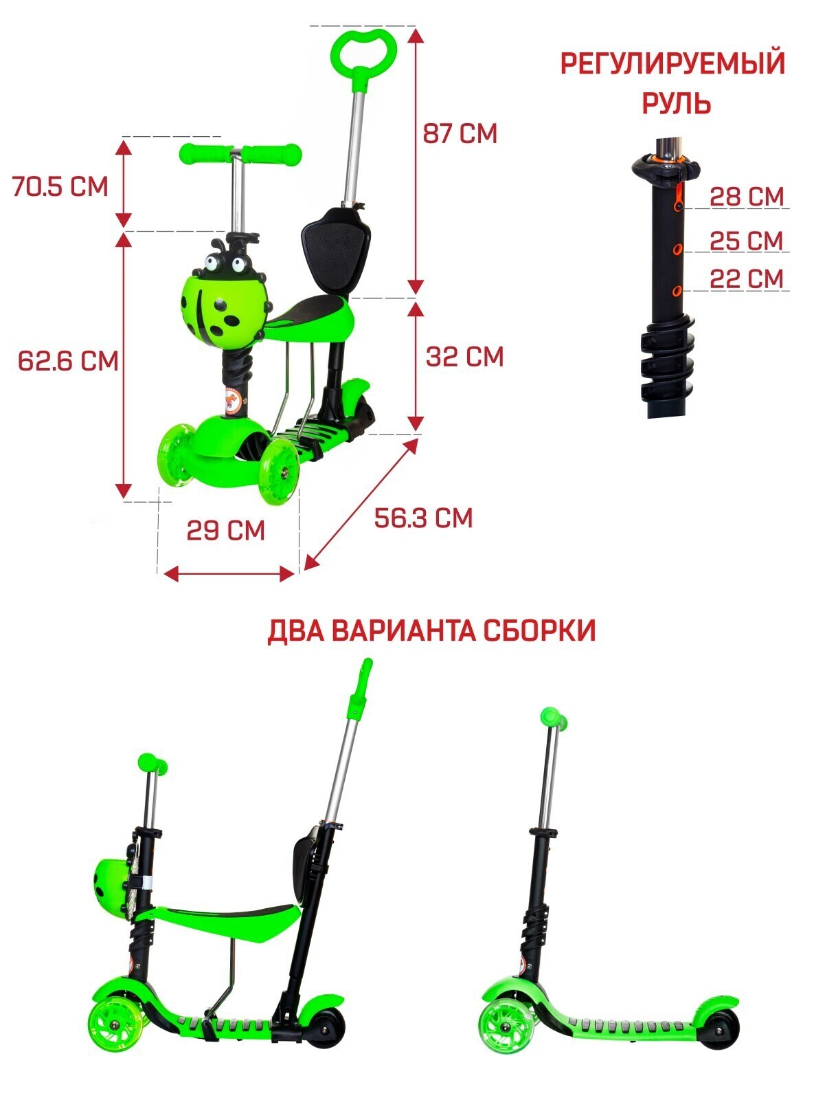 Регулируемый по высоте телескопический руль (63-70 см.), с мягкими резиновыми ручками с широкими заглушками для защиты позволит подобрать комфортную высоту. Сиденье с мягкими вставками можно установить в трех положениях. На родительской ручке установлена спинка сиденья, для варианта, когда вы везете ребенка. Площадка для ног с противоскользящими элементами: длина 28 см., ширина 14 см. Спереди можно установить пластиковую корзину для детских мелочей в виде смешной букашки.