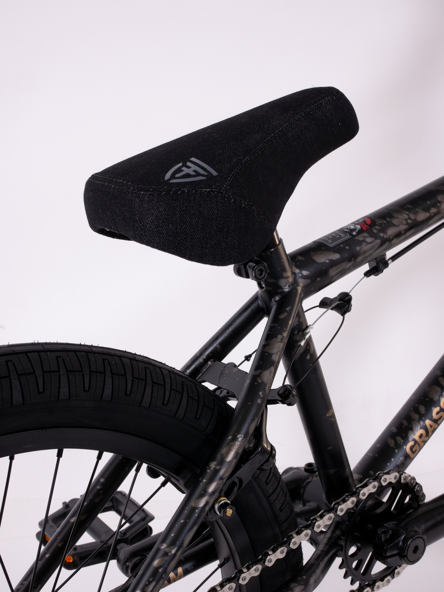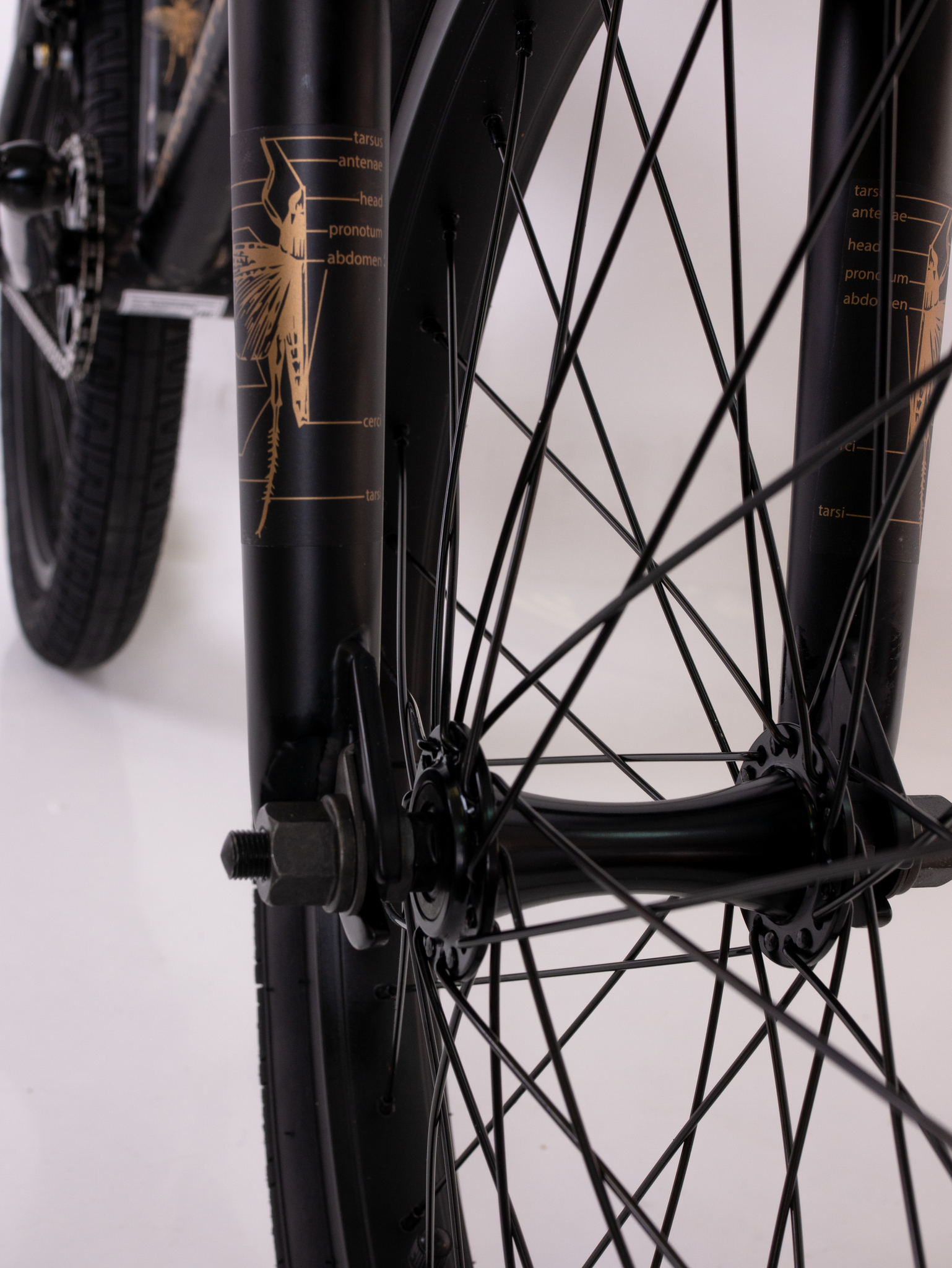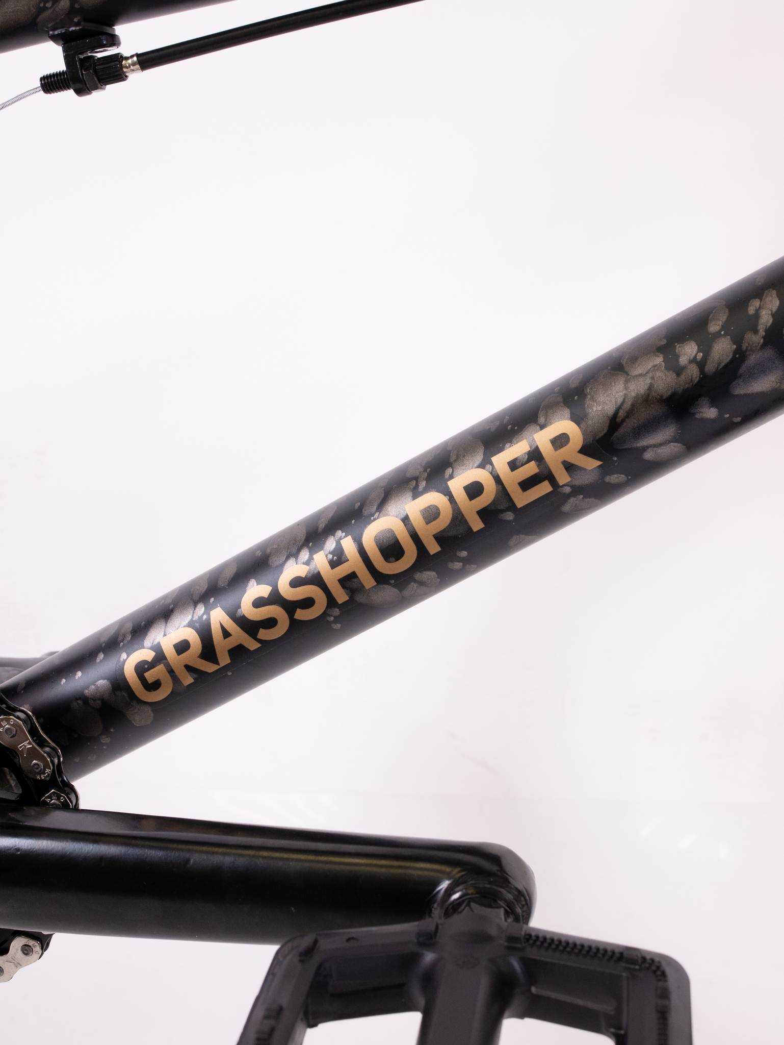 На этом велосипеде установлен один задний тормоз, в основном его используют, чтобы сбросить скорость в самом конце серии из трамплинов. Колеса собраны на двойных алюминиевых ободах - ведь прочные колеса, важная часть экстремального велосипеда. Интегрированная рулевая Neco, алюминиевые педали Wellgo, алюминиевый вынос ТТ - все это делает Grasshopper легким и надежным.