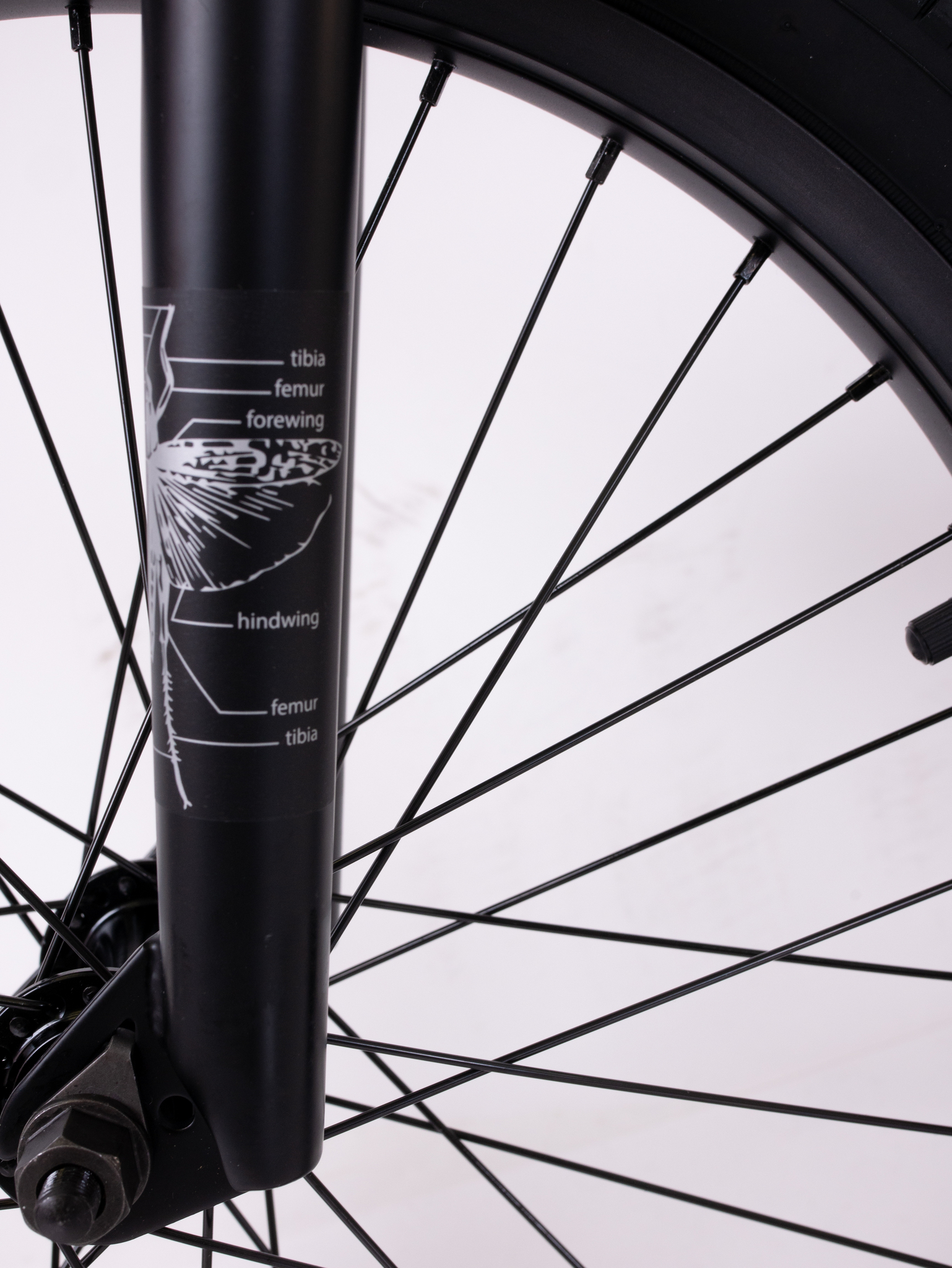 На этом велосипеде установлен один задний тормоз, в основном его используют, чтобы сбросить скорость в самом конце серии из трамплинов. Колеса собраны на двойных алюминиевых ободах - ведь прочные колеса, важная часть экстремального велосипеда. Интегрированная рулевая Neco, алюминиевые педали Wellgo, алюминиевый вынос ТТ - все это делает Grasshopper легким и надежным.