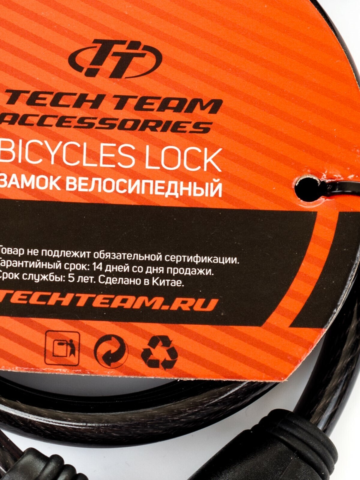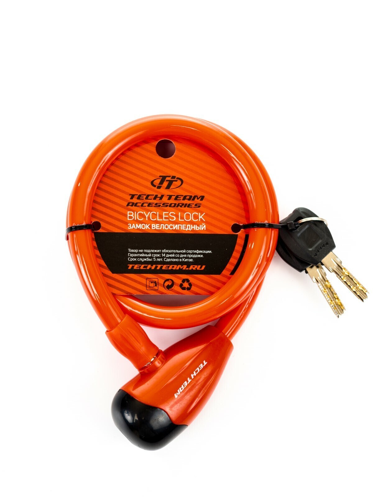 Велозамок Tech Team используется для предотвращения похищения вашего велосипеда или самоката. В комплекте два ключа. Замок имеет спиральный трос и изготовлен из стали, пластика и резины.